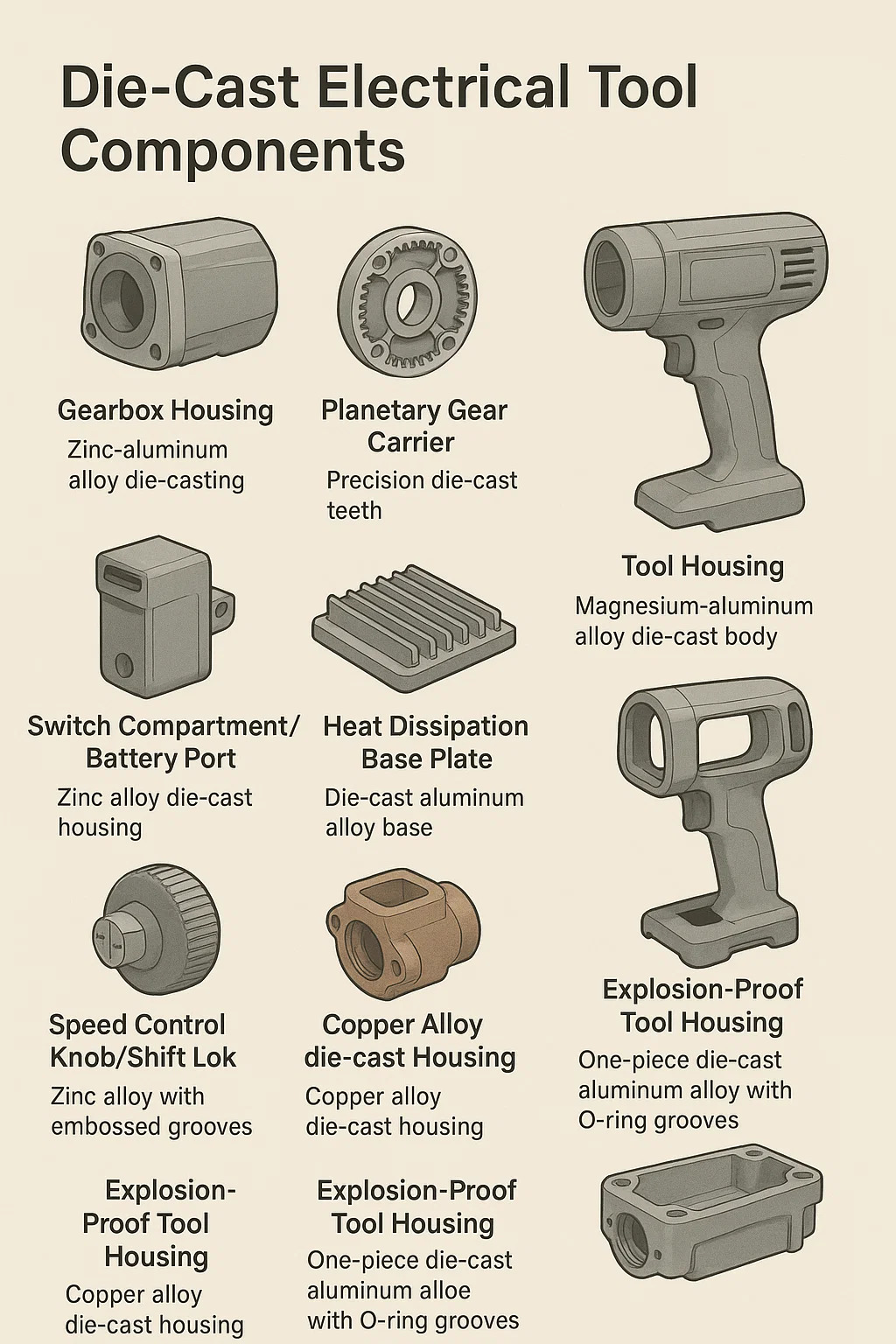 Instrumentum electrica mori-cast componentes referunt ad partes metallicas nucleos factorum per processum altum pressurae mittentes. Locutio clavis doloris puncta instrumentorum electricorum, ut altum impulsum, dissipationem caloris, et salutem electricam. Clavis applicationes et lineamenta haec sunt: