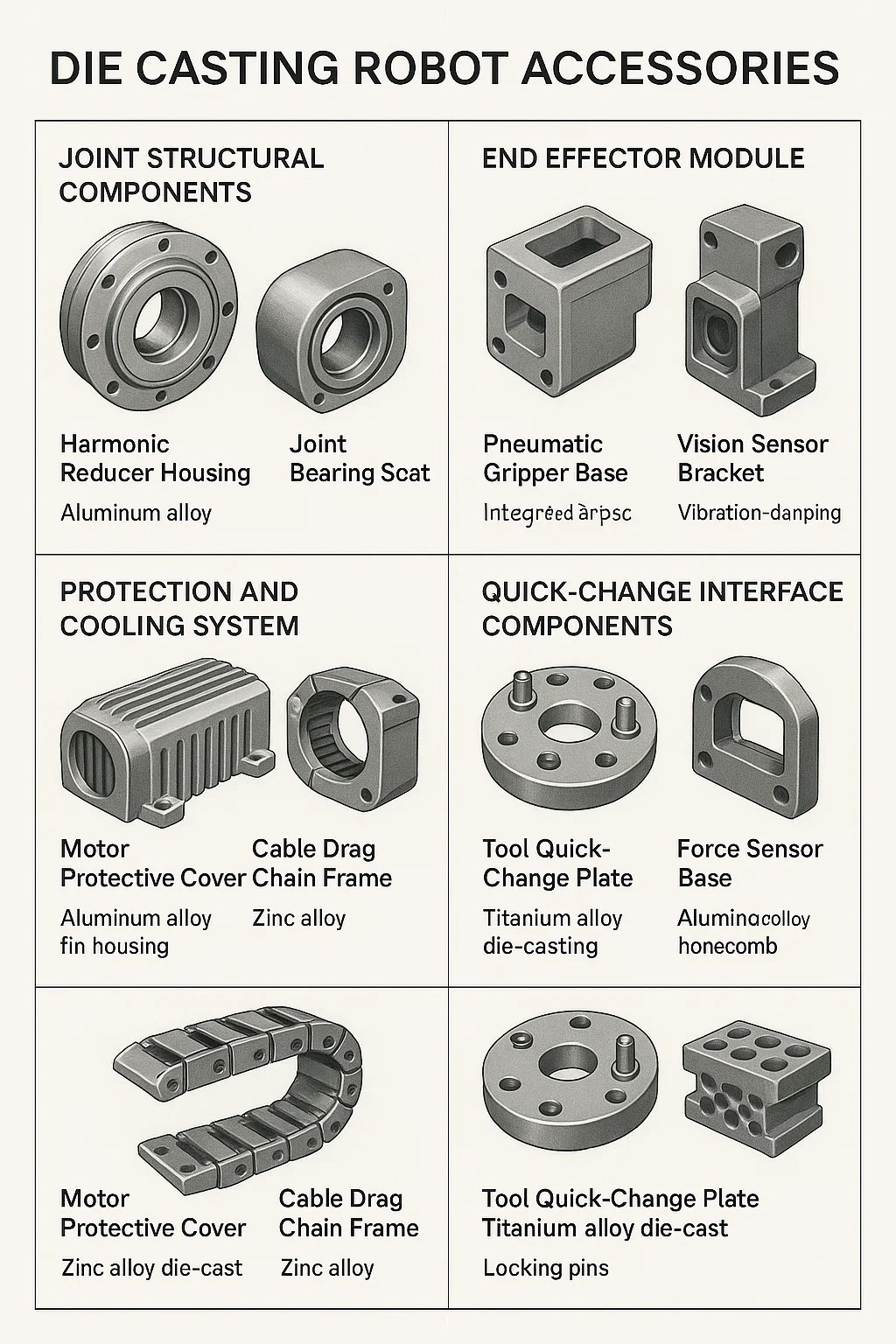 Die casting robot accessiones Sunt core metallum components fabricari per a summus pressura casting processus. Et address in core requisitis industriae robots, inter praecisione, lightwewighting, et diuturnitatem. Key applications et features sunt ut sequitur: