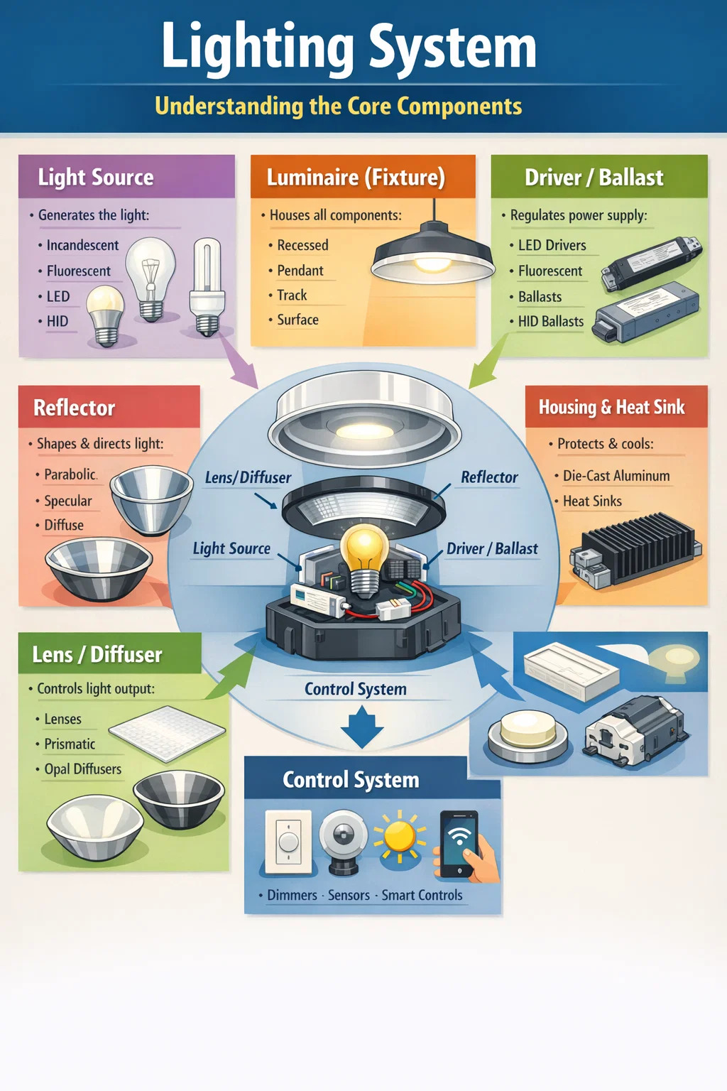 Illuminatio non est solum circa illuminationem — est ratio diligenter machinata ex componentibus distinctis et dependentibus. nuclei componentes illuminationis includunt fontem lucis, luminaire, saburram vel agitatorem, pondero, lens vel diffundens, habitationem et systema temperantia. Unaquaeque pars munus peculiare tenet, quomodo lux producatur, formatur, distribuatur, agatur. Sive domum cogitas accendi consilium, spatium commerciale constituens, sive institutionem exsistentem sollicitudinem, has partes intellegendo tibi commodum decretorium dat.