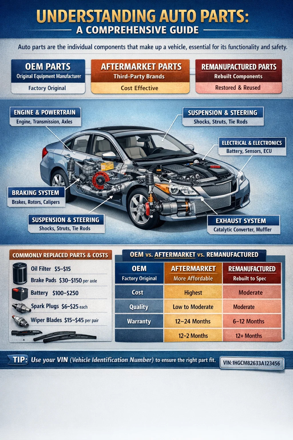 Ad salutem criticam componentes sicut moduli airbag, ABS unitates, et membra corporis fabrica, OEM fere semper electio suadetur. Ad exercitationes uti res gestas sicut columellae aeris, laminae deletrices, et scintillae plugae, summus qualitas partium autocinetorum a notis creditis ut Bosch, Denso, NGK, vel Monroe praestantem valorem praebent ad 20% ad 60% minus quam OEM pretia. Partes dissolutae sunt imprimis sumptus efficaces pro conventibus pretiosis sicut alternatores et potestas gubernationis tormenta, ubi reman unitas $ 150 ad $ 400 novis OEM Morbi cursus comparari potest.