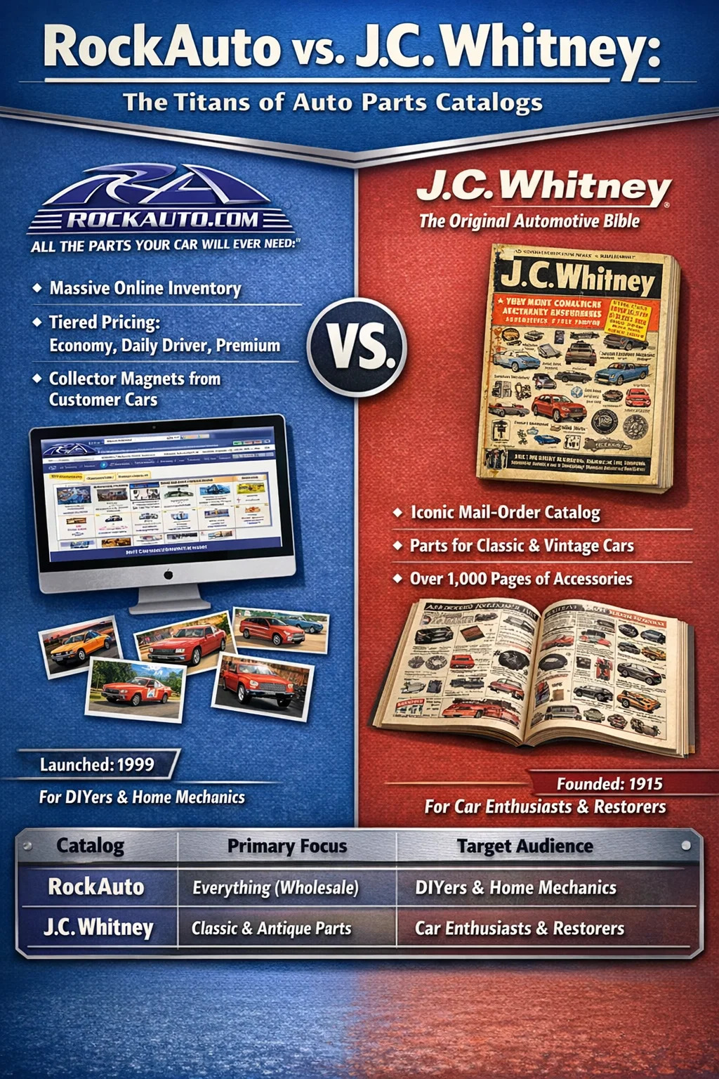 Cum homines de clarissimis autocinetis partibus catalogum quaerunt, duo nomina colloquii dominantur; RockAuto nam digital aetate et J.C. Whitney ad histor *icum. RockAuto modernus factus est vexillum auri, offerens database online copiose, quod fere omnes tegit parte collisionem autocineti factorum in ultimis aliquot decenniis. Nam qui memoriam librorum chartarum ordinis electronicorum memorant, rex J.C. Whitney indubii erat, qui "Bible" automotive DIY mundi notus erat.